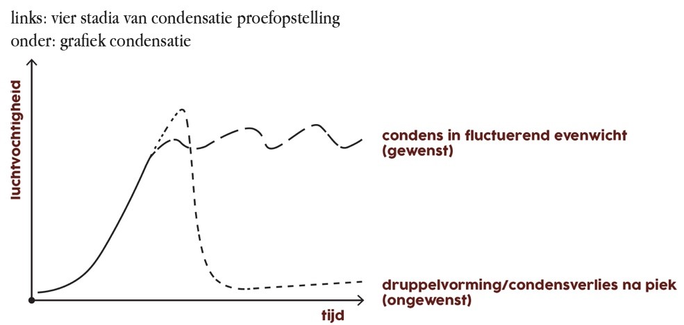 The trials showed the following hypothesis in relation to De Wasemer to be true: “The desired effect (a total sheen of condensation on the glass without turning watery) is best achieved when the moist ground under De Wasemer warms and the air vaporizes onto the glass and when any excess humidity is avoided by way of (natural) ventilation and a consistently cool glass surface.”